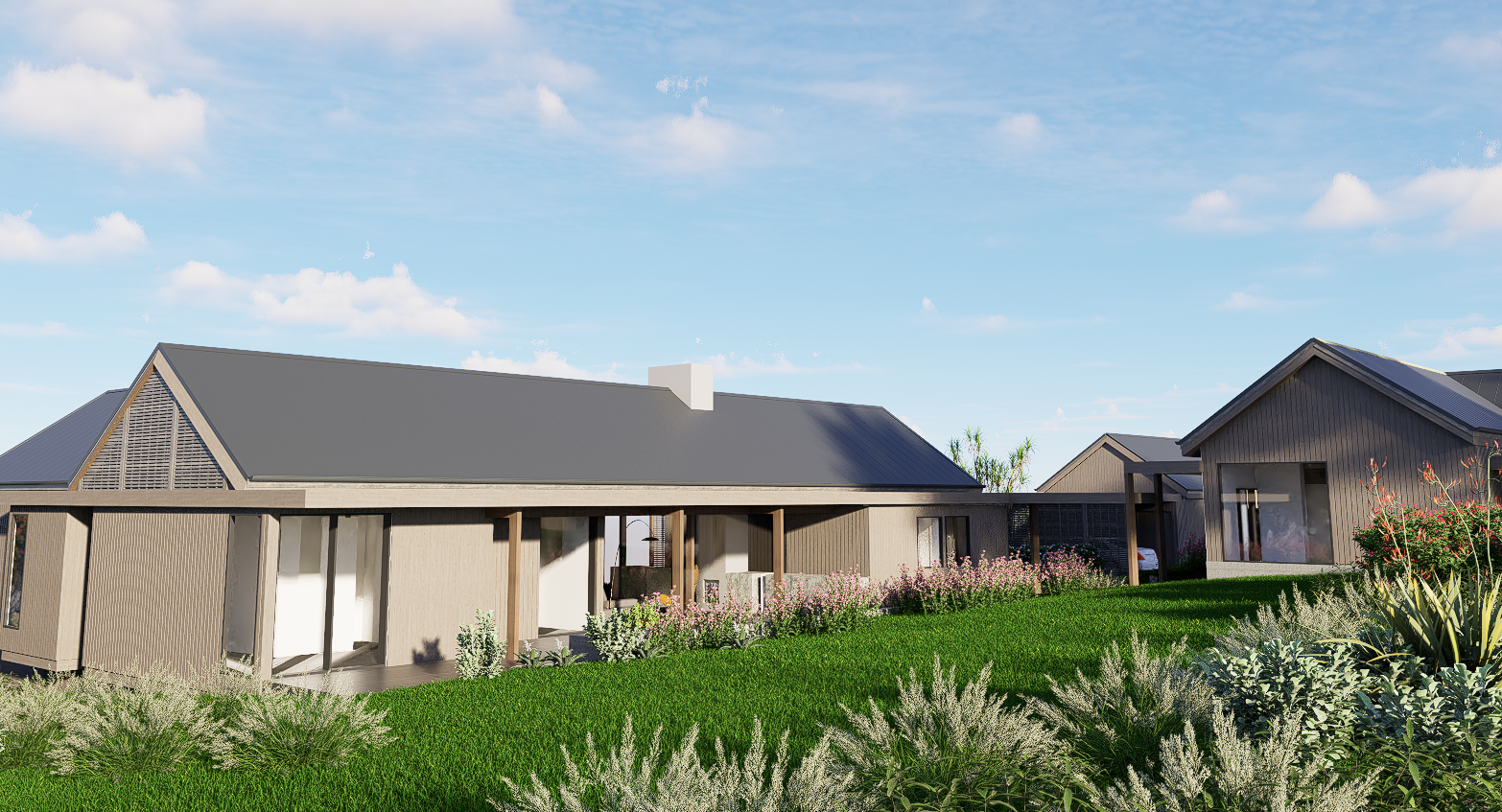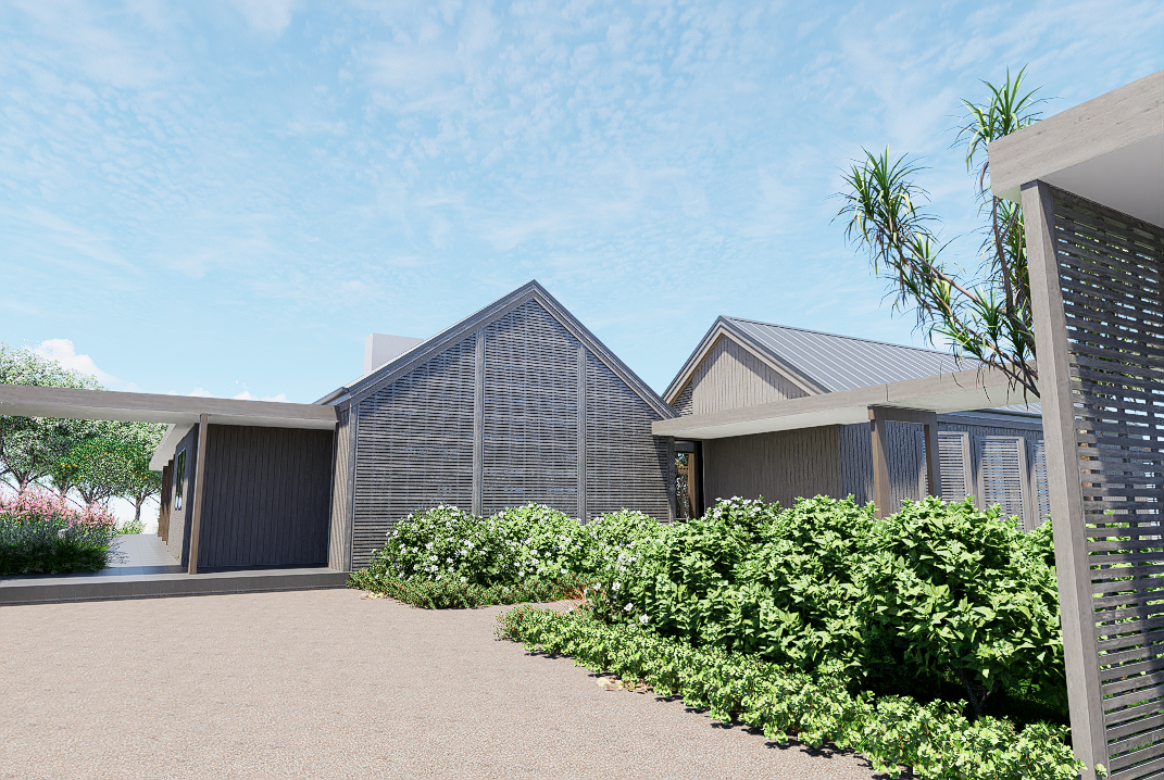 A cluster of buildings, including garaging and a minor dwelling form a sheltered courtyard through which you enter the main house. Screens provide filtered light into the main living spaces and the central terrace opens out on to a pool area. The materials are honest and textural, natural and sustainable allowing the owners to feel at one with the landscape.