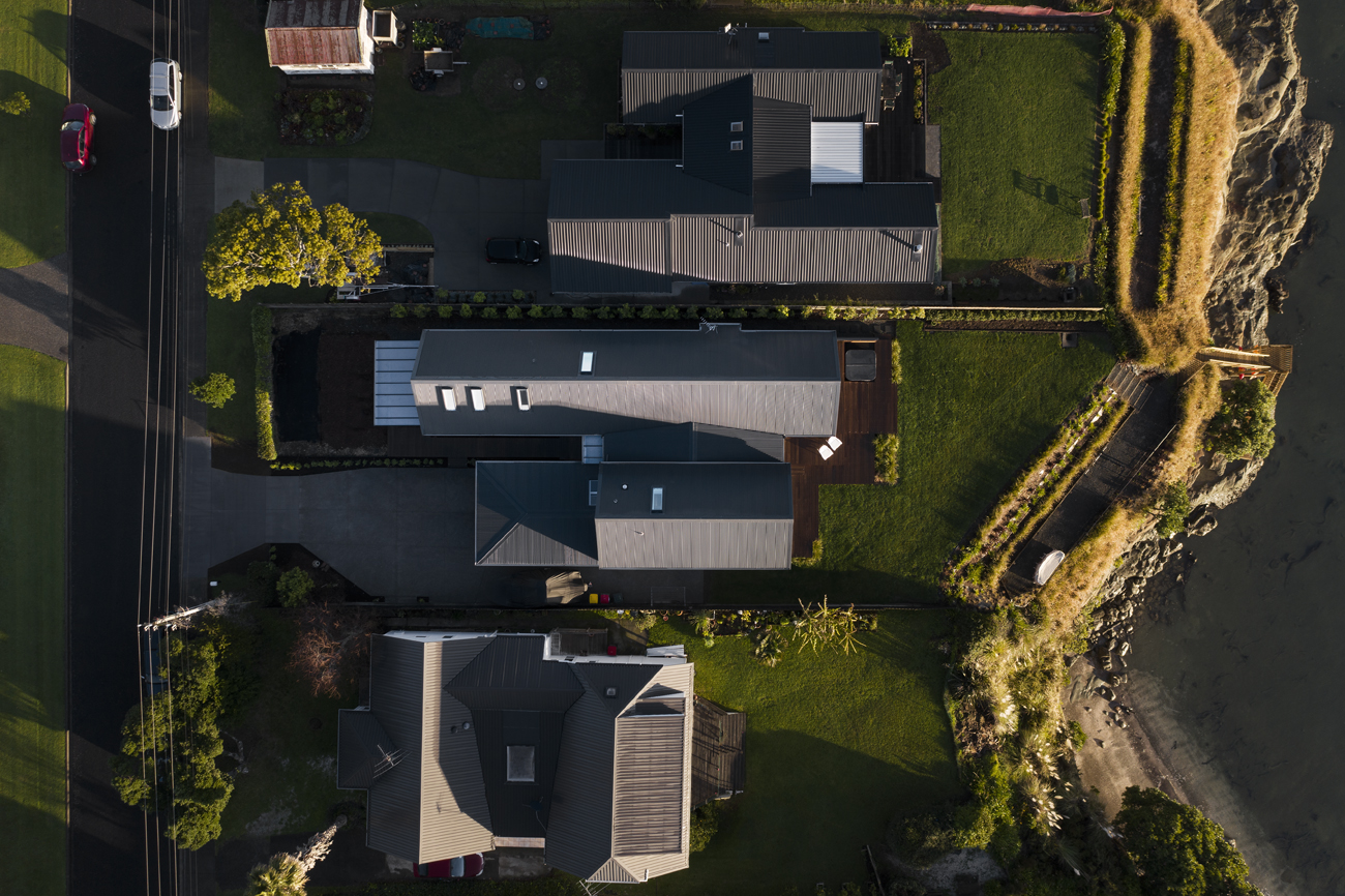 To support this performance, we look to a palette that respects the New Zealand ecosystem. Darker Colorsteel tones—like the deep charcoals and deep blue appearance of our rugged headlands—are used not just for their aesthetic restraint, but for their resilience against the salt-laden winds of the clifftop and their ability to blend with the environment. When paired with natural timber and stone, the house begins to patina and "belong" to the ground it sits upon.